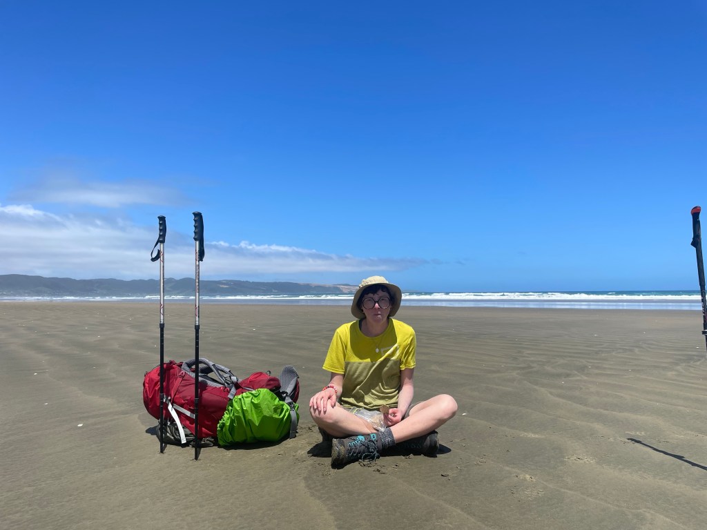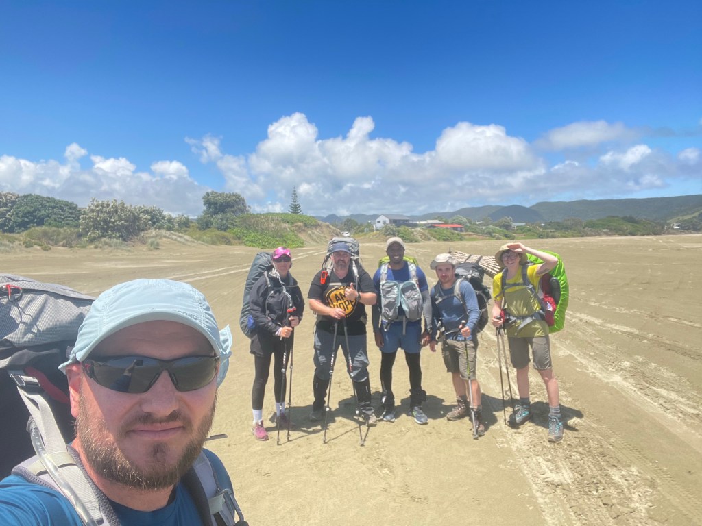 On our last break lying on the sand Nici & Kévin caught up, joined us & we walked the last stretch to Ahipara together.