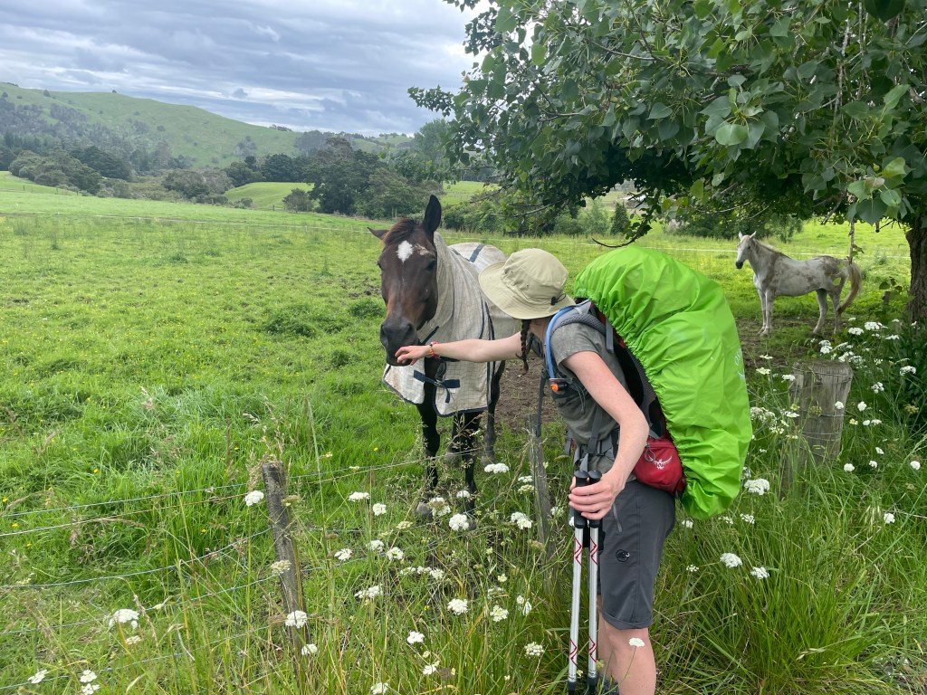 Today’s walk was consistently tar seal roads, occasional avoiding big logging trucks. We did another 5km before the next break, where we sat down & realised our spot wasn’t that great as it smelt like something had died there, but once the pack was off & we had sat down, it took a good 10 minutes to be able to move again.