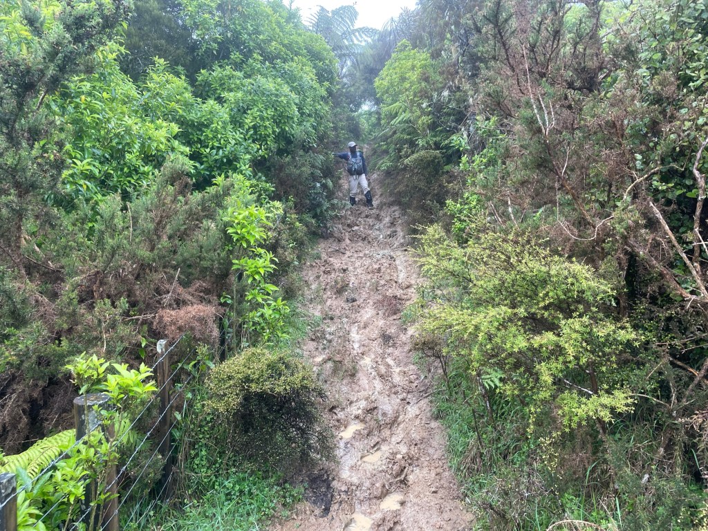 We met Kevin walking at the start, but soon lost him until the end of the day. The 1st part of the track was a 300+ metre climb & was exhausting as I’m still not a hill person! Then as it flattened off it turned into mud which at times was technical. We stopped for a 15 minute break at the weather station about 2 & a half hours in. The good thing is it only took us 3 hours & 45 minutes to get to Matakana valley road.