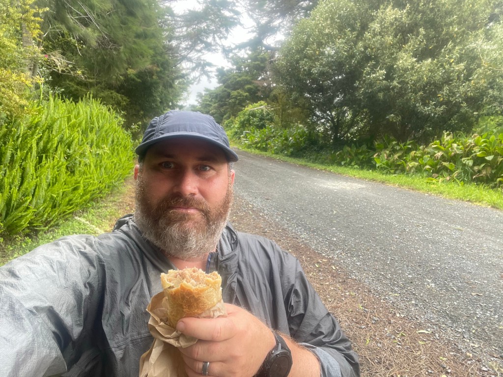 About 11km into today Mark drove up with a couple of sausages rolls for us!