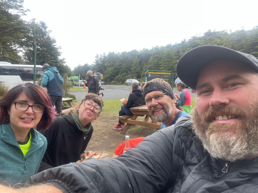 We sat there eating lunch & having a coffee, then Frank appeared who had spent the night at the DOC hut on the mountain & then Nici also showed up, they joined us for lunch.