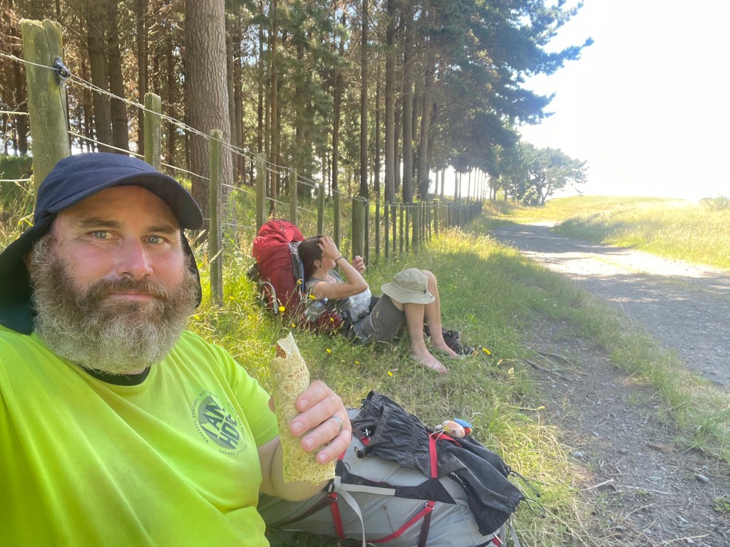 After leaving the streets up here it turned pastoral & was sealed road, about 10km in Nici realised she had left her pack cover back in the motel, she called the motel & managed to get it located, she then rang the lovely people who she had been staying with who picked it up, bought it out to us with a pie & an L&P each! Such a nice morning tea!