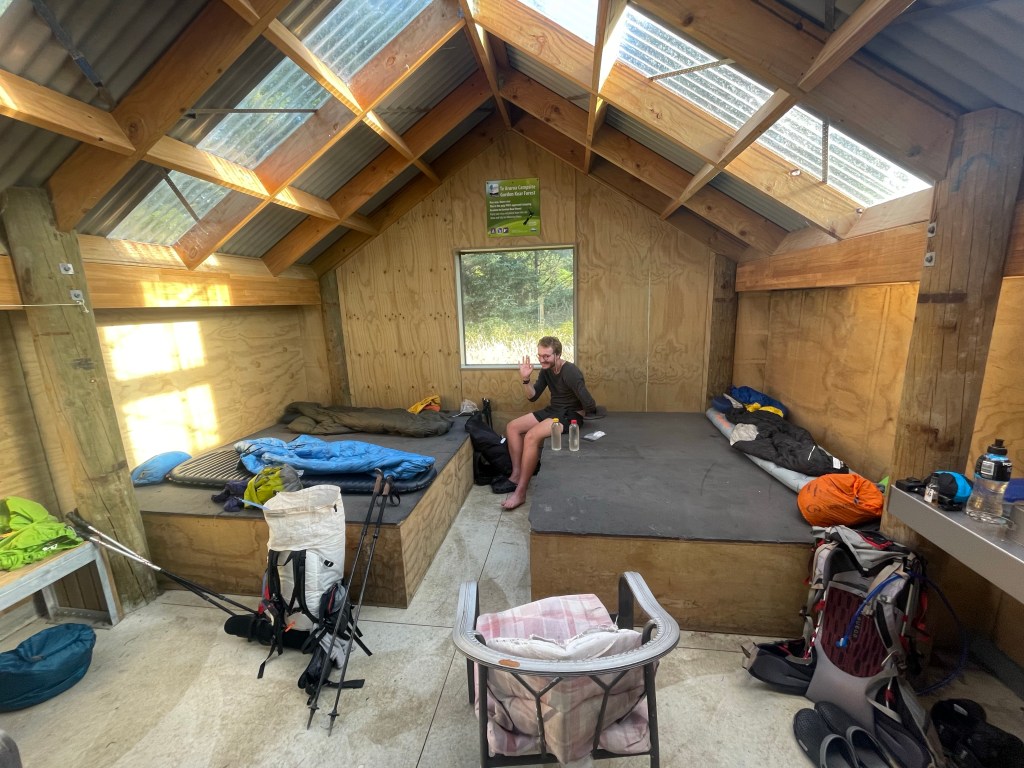 The last 8km was 4km of mountain bike track & 4km of gravel road / forestry road. We then arrived at the awesome little Whare o Moturimu hut.