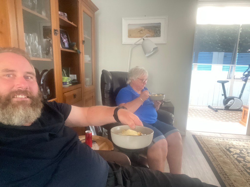 After dropping Sam off & going back to Aunty B’s house, I got showered! Washing on & had an amazing dinner of Pork chops, corn, salad & mashed potatoes! Yum. We also had dessert, ice cream & peaches, so good!