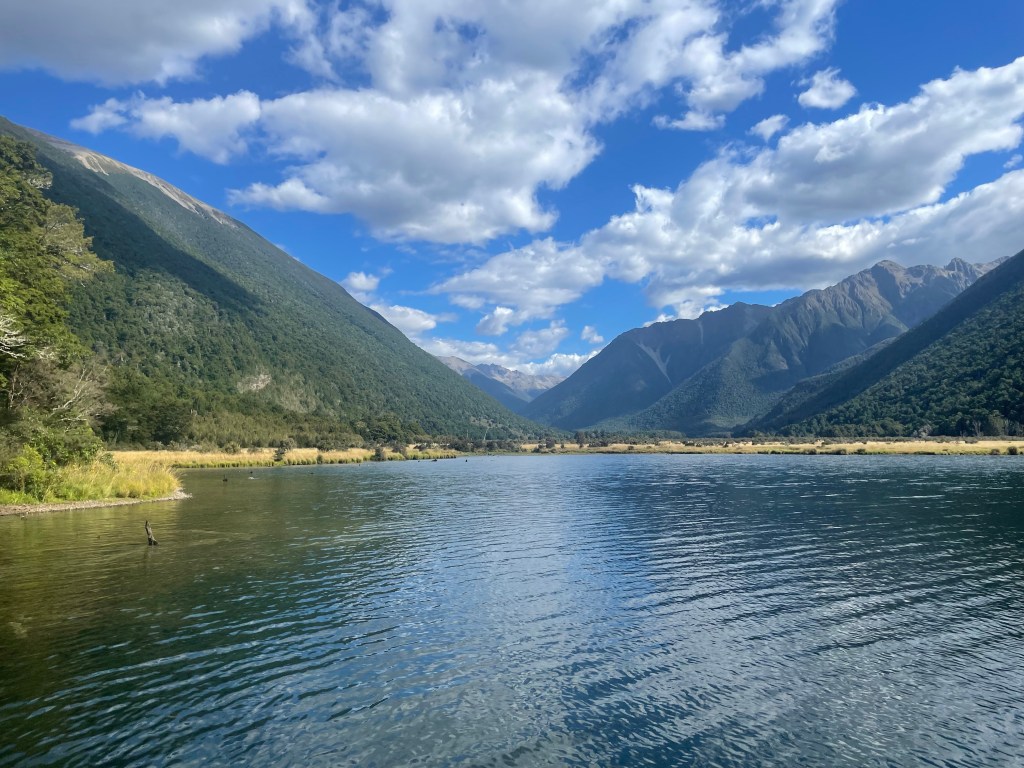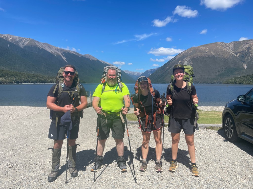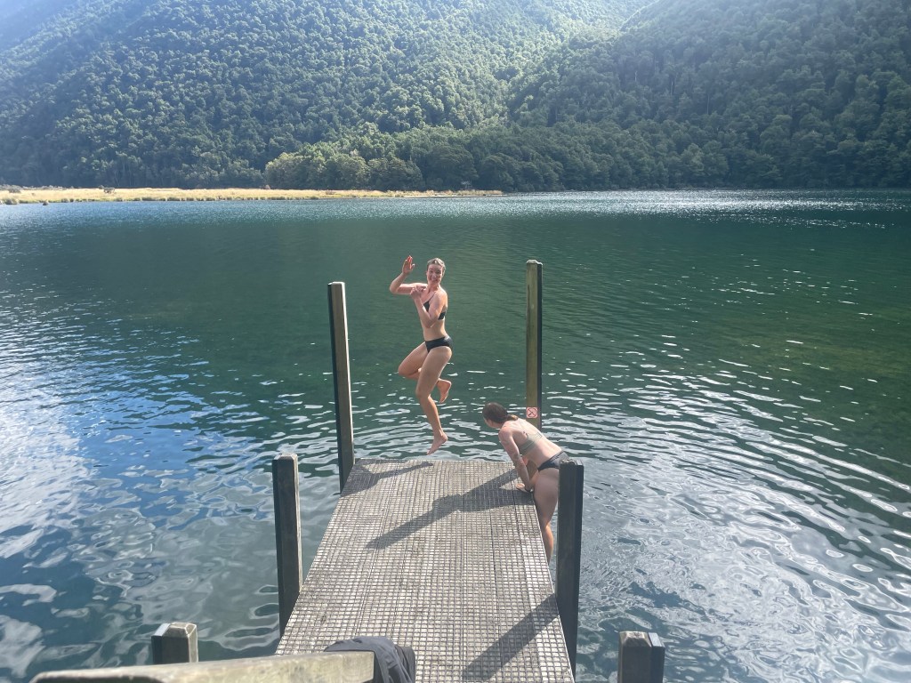 We then headed to St Arnaud & arrived just before 1pm. The walk to Lakehead hut was fairly quick as it’s only 9.5km. This took us just over 2 hours. About 700 metres before the hut there’s a jetty at the end of the lake. We decided this would be a perfect place for a swim & all made the decision to go to the hut, unpack & then go back for a swim.