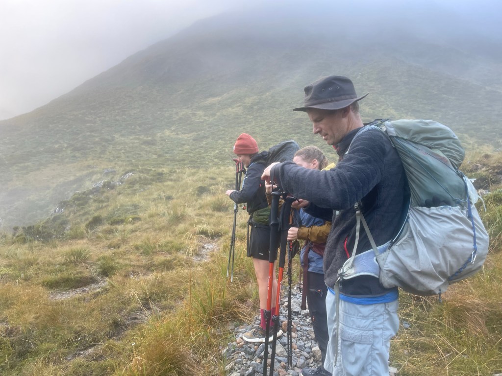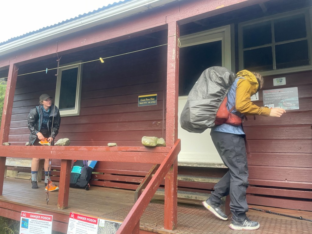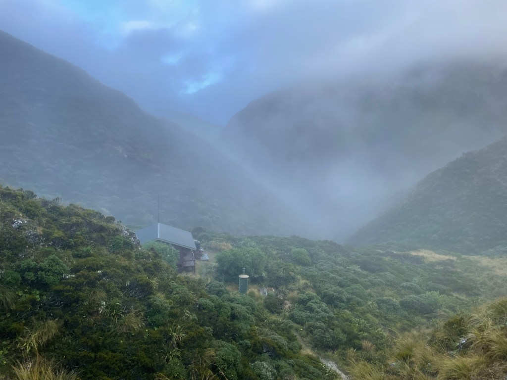 The day started off overcast & drizzly. I had to put my wet clothes back on this morning. Goat pass hut is a nice 20 bed hut but lacks a fireplace, at least it’s only a Nero today.