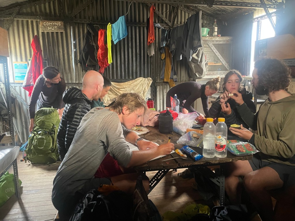 Anyway, the timing was right we arrived at Comyns hut 3 hours & 59 minutes after setting off from the drop off point. It was just before 2pm. There were already 5 in the 8 bunk hut with us 3 making it 8 & a few hours later the last two from our shuttle turned up so we are 10 in the hut this afternoon/evening.