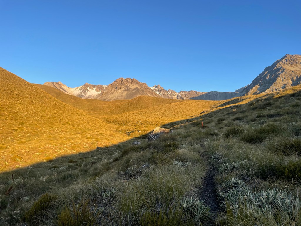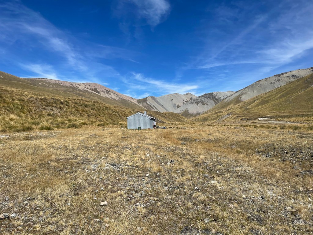 From here it was 4km to Stone hut where i decided I would stop for an early lunch today. The track through the tussock was quite hard to find a lot of the time this morning & I had trouble finding the next orange pole often, but I finally made it to Stone hut just on 11:20am.