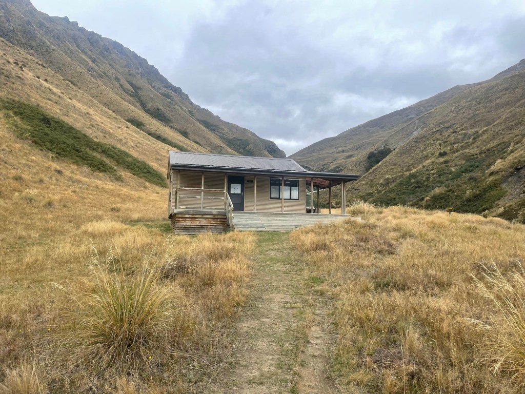 After coming out of the valley & into the open the track sidled around the hills & before long the hut was in sight.