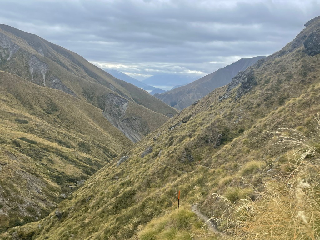 Beautiful views back down to lake Wanaka from here. I didn’t stop long, again because it was cold. When I started the descent I was amazed at how steep it was, following a ridge line down with drop offs either side! At one point I slipped and slid on my bum for a few meters.