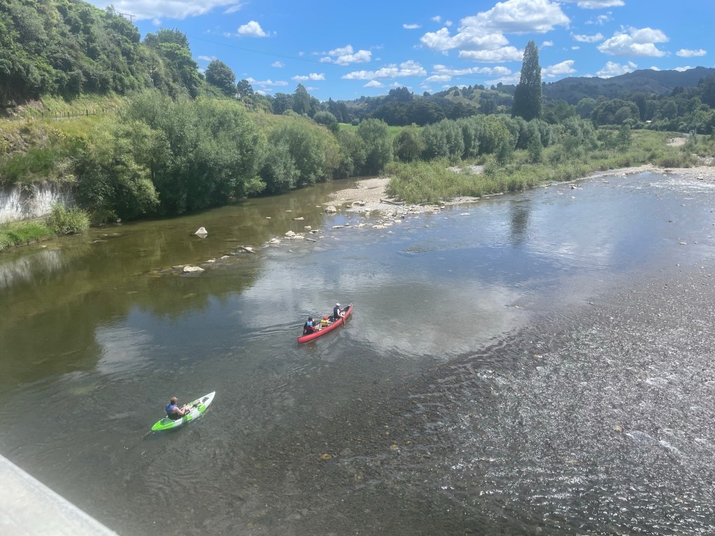 Nici! Heading out of town over the bridge I watched a Canoe & a Kayak going down the Whanganui river. They made it look easy.